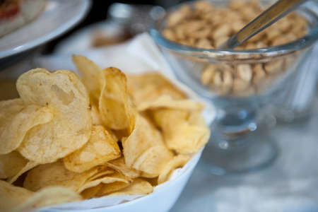 potato chips. delicious beer chaser. best food for quick snack. crunchy spicy crisps on dark background