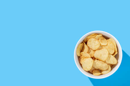 Potato chips in a bowl on a blue background. Top view, flat lay