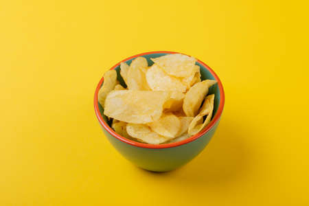 High angle close-up of potato chips in green bowl on yellow background. unaltered, unhealthy food, snack and salty snack.