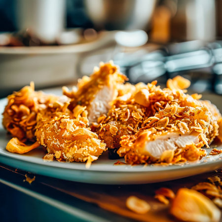 Delight in this close-up view of crispy fried chicken garnished with fresh parsley, showcasing mouth-watering texture and rich flavor for culinary enthusiasts.