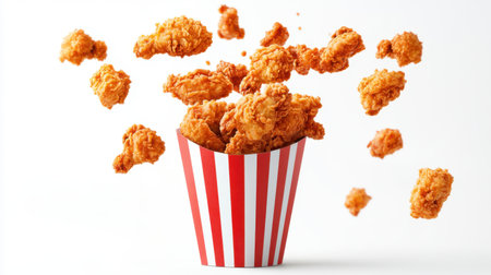 Crispy fried chicken pieces flying out of a red-and-white paper bucket, isolated on a clean white background, creating a dynamic, fun food scene