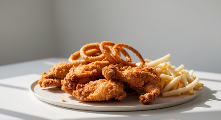 AI Generated. Crispy Fried Chicken Platter with Fries and Onion Rings
