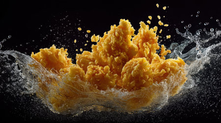 Experience the lively moment of crispy fried chicken pieces splashing into water, creating a mesmerizing display of textures and flavors. Perfect for food lovers.