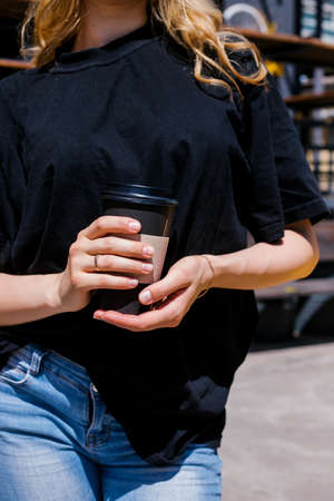 A young woman stands outside on a bright sunny day. The girl is holding a paper cup of coffee. Walking around the city, a way of life.