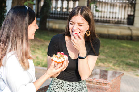 lifestyle portrait of two attractive caucasian girls laughing enjoying delicious looking donuts outdoor in city park. junk but tasty food for positive mood.