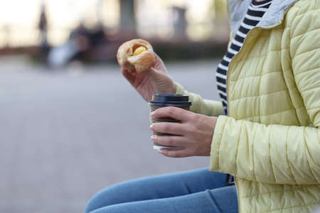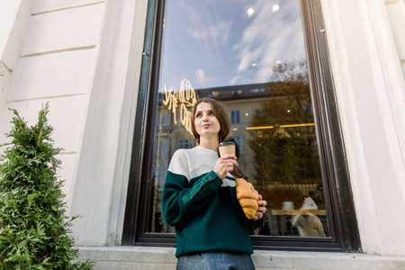 Young pretty woman standing outdoors in front of big window and looking away, holding croissant and take away coffee in hands