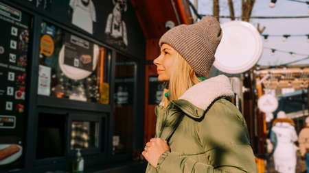 Woman at an urban street food court chooses food from a menu. Street food festival. Sunny day in winter or autumn. The woman is warmly dressed