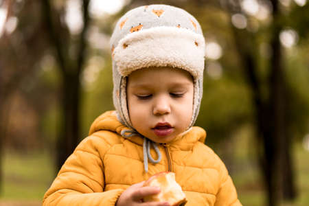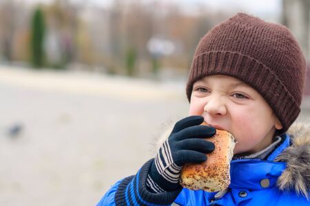 Boy in a blue jacket eats pie with poppy seeds on the background of the fall of the city