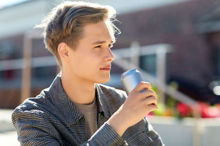 young man with drink in tin can in city