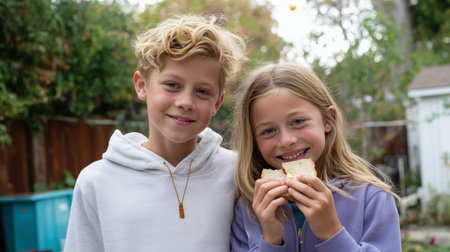 Two children enjoying a sandwich together in a backyard on a sunny day in autumn