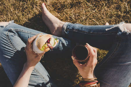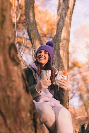 Female hiker eating sandwich in nature. Woman tourist having breakfast or lunch at picnic, eating hot sandwiches while spending time in nature. traveler stopped rest and eat campfire toasted sandwich.