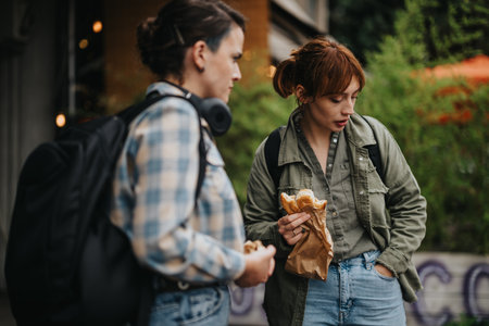Cheerful carefree students eat fast food on the streets of city. Generative AI