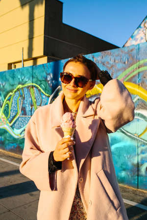 Outdoor lifestyle portrait of young trendy girl eating ice cream in summer hot sunny day in street city