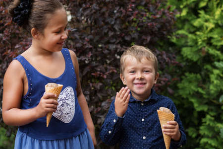 Happy girl and boy eating icecream in Park