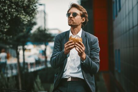 Handsome trainee having a lunch break near his office. Young man eats hamburger outside of his business center. Non healthy food concept.
