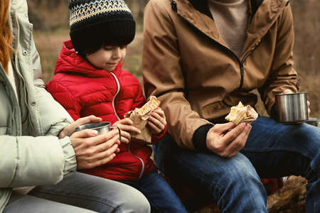 Happy family with sandwiches and hot drinks spending time together in forest, closeup