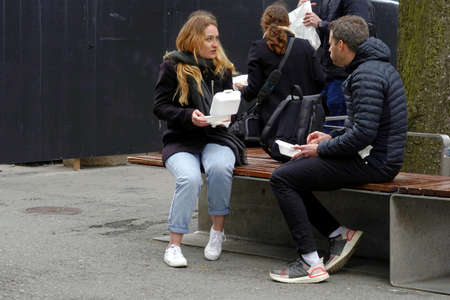 Bern, Switzerland - 04 03 2021: Street life in the city, in time of coronavirus and covid-19 crisis. People eat take away food because restaurants are closed. Two couples eat on benches in the city.