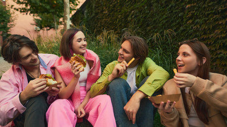 Four friends laughing and sharing burgers and fries in urban park. Concept of social connection, youth lifestyle, joy, friendship storytelling, and street-food.