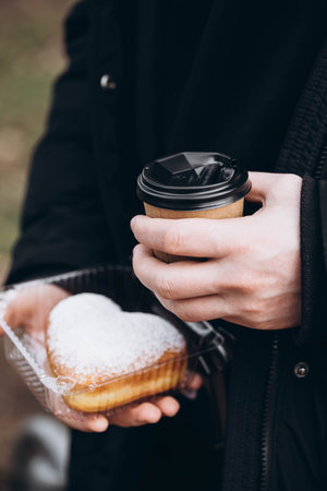 A paper cup of coffee and a heart-shaped donut in male hands, close-up.