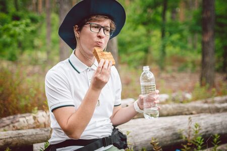 Woman tourist eating sandwich and drinking water outdoors. Refreshment during hiking in forest at springtime