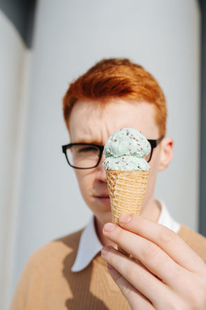 Serious young ginger man in glasses holding ice cream cone over his face