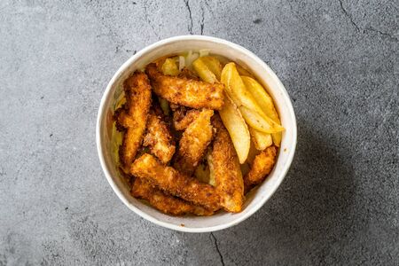Take Away Fish and Chips made with Breaded and Fried Seabass in Plastic Box Package / Container. Fast Food.