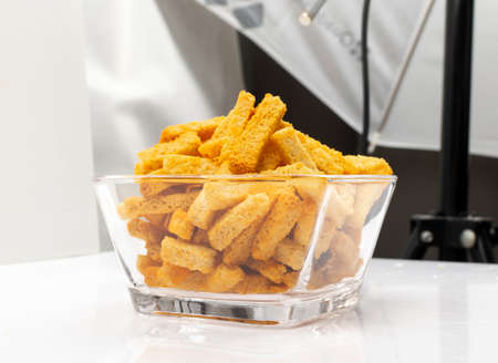 Homemade crunchy croutons with garlic, salt, herbs and spices. Spicy rusk sticks, seasoning rusks, small fried bread snacks, salted breadsticks, beer appetizer