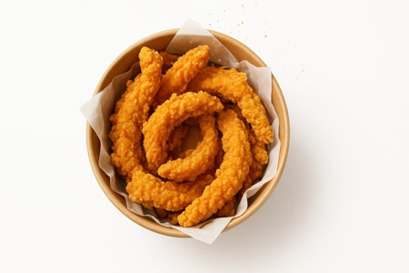 Top down kraft paper bucket lined with parchment crunchy chicken strips arranged in a loose spiral clean fast food styling on white