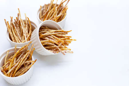 Fried taro sticks on white background.
