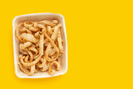 Fried crispy pork rinds in plate on yellow background.