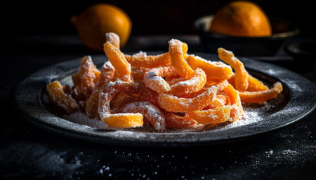Organic vegetarian meal, fresh citrus fruit, homemade honey candy stack generated by artificial intelligence