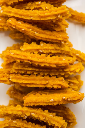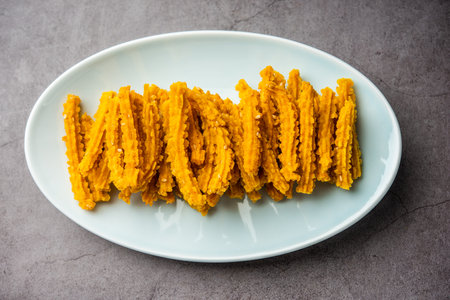 Bhajni chakli sticks or crunchy murukku snack made using diwali festival, favourite munching food