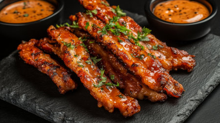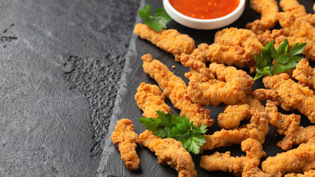 AI Generated. Crispy Chicken Tenders with Dipping Sauce on Black Plate