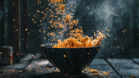 Golden noodles flying in the air with a dark kitchen setting in the background, creating a dramatic and dynamic culinary scene full of motion and energy.