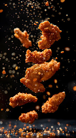 Pieces of breaded fried chicken falling against a black background