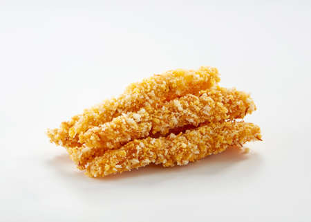 Close up of rustic pan fried breaded chicken tenders