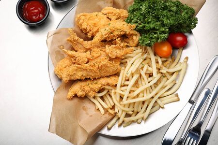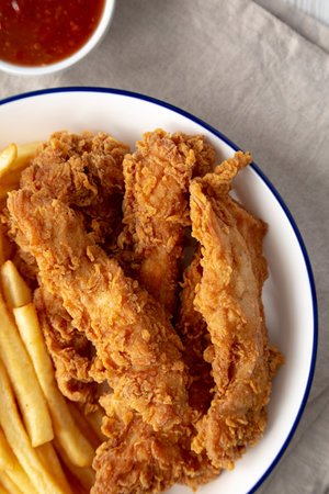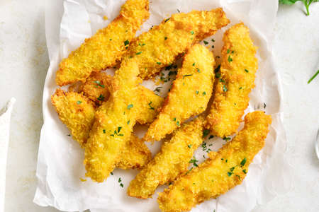 Crispy fried breaded chicken breast strips over light stone background with free space. Top view, flat lay