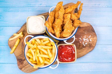 Fried chicken dippers in bucket with sauce on blue background.Chicken breaded strips in small ceramic pots with ketchup and white sauce and french fries.