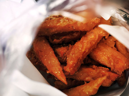 Freeze Motion Shot of Flying Fresh Fried Chicken Wings or Strips, Close-up