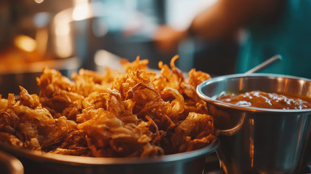 A close-up of crispy onion bhajis served with a side of chutney, freshly fried from an Indian street food stall.