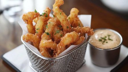 This image features a basket of crispy fried shrimp, perfectly golden and served with a creamy dipping sauce. Ideal for menus and food blogs.
