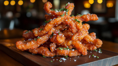 A delightful stack of crispy fried snack sticks garnished with fresh herbs and seasoning, presented on a wooden platter, perfect for sharing.