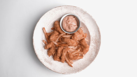 AI Generated. Closeup of Crispy Fried Food on a White Plate with a Blurry Background