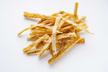 Food, snacks or jerky made from dried dehydrated salted fish with spices.