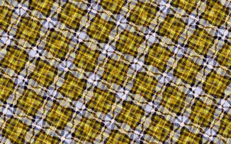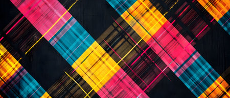 Vibrant plaid pattern with intersecting diagonal lines and color blocks in bright vivid hues of pink blue and yellow against a dark background The dynamic eye catching design creates a bold