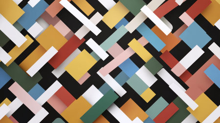 A vibrant and dynamic abstract composition featuring overlapping rectangles in various colors, creating a visually engaging pattern.