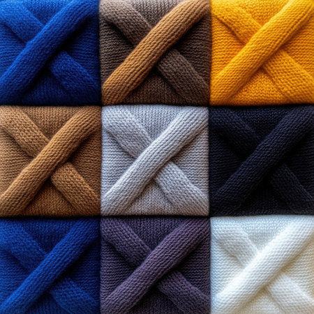 A row of knitted sweaters with different colors and patterns. The sweaters are arranged in a grid, with each row and column having a different color and pattern. Scene is cozy and warm