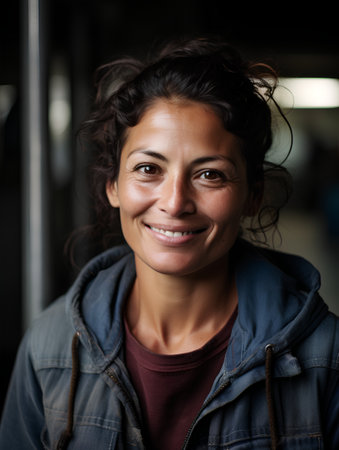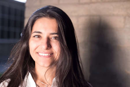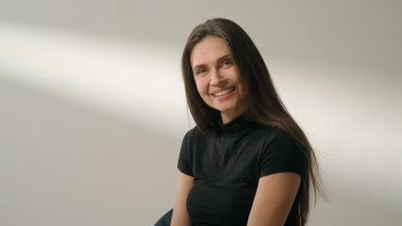 Confident woman with long hair smiles warmly while seated in a well-lit indoor space.