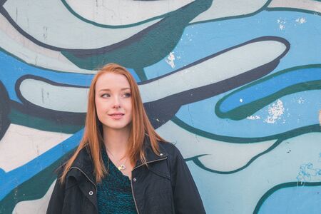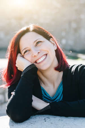 Portrait of a pretty girl with red hair against the blue sky.Woman portrait without retouching with her natural imperfections