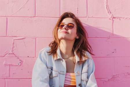 A young woman is leaning back with a content expression on her face, basking in the warmth of the sun.